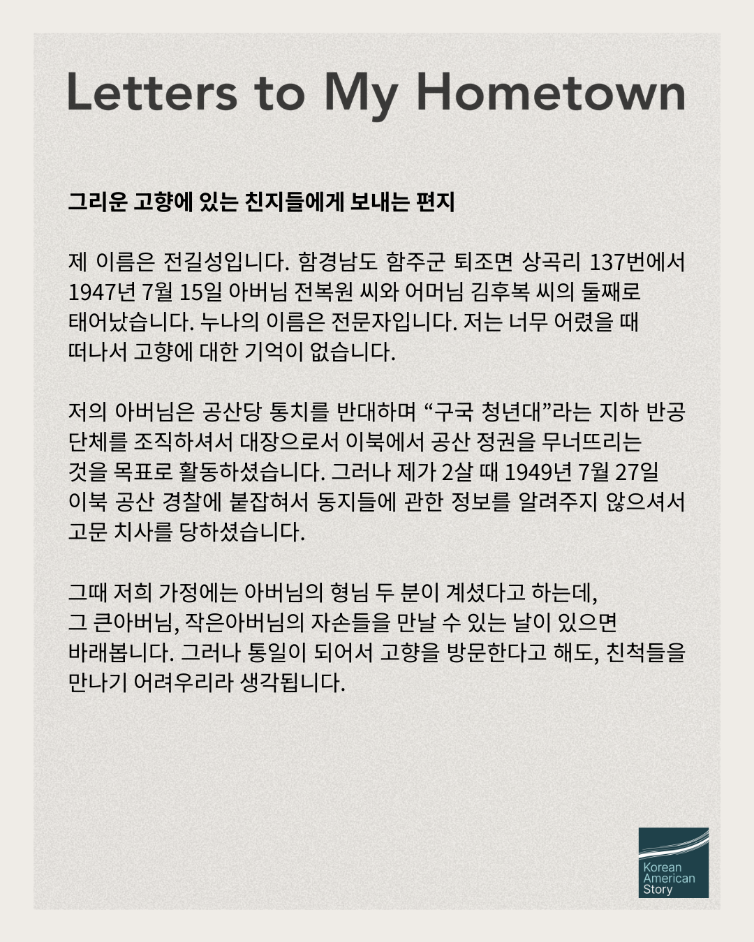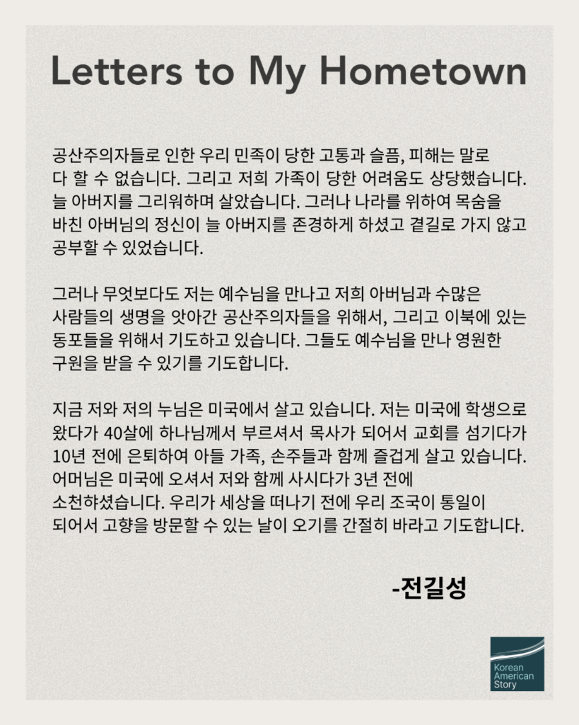 This iteration of Letters to My Hometown invites audiences to listen and reflect upon intergenerational conversations of the Korean American community whose divided families have sustained the traumas of their homeland’s partition. Generously supported by American Friends Service Committee (@afsc_org), these conversations aim to take steps toward transforming the intergenerational traumas of the Korean War into opportunities for collective remembering, learning, and healing.